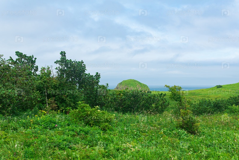 Природный ландшафт острова Кунашир с травянистыми холмами, вулканическими скалами, вулканом в облаках и океаном вдалеке