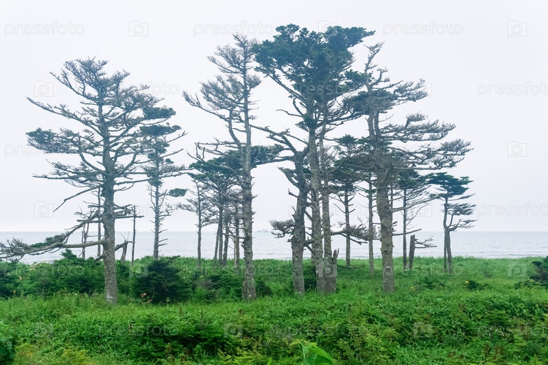 Прибрежный пейзаж острова Кунашир с изогнутыми ветром лесными массивами