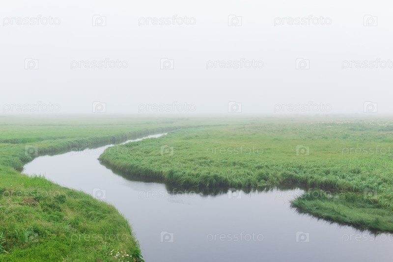Утренний пейзаж, обширный луг с сочной травой скрыт туманом