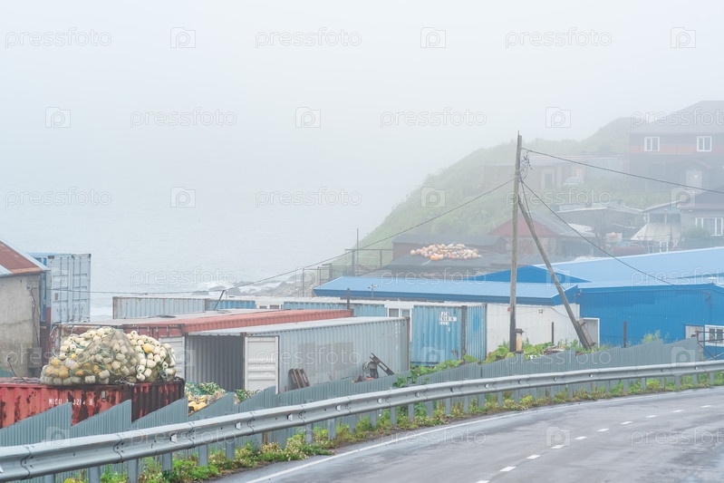 Вид на поселок Южно-Курильск на острове Кунашир во время тумана