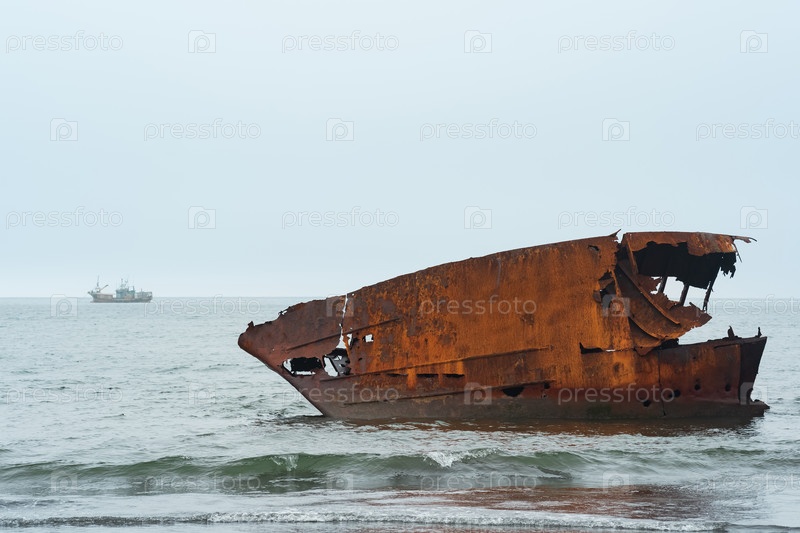 Ржавое кораблекрушение на фоне туманного морского пейзажа с кораблем вдалеке