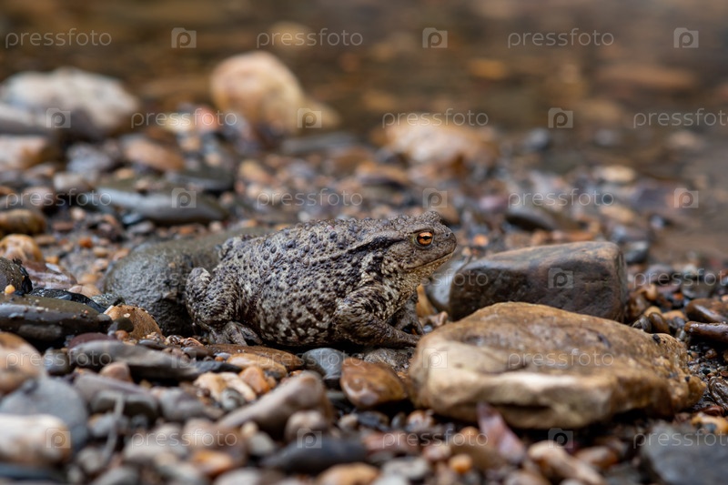 Обыкновенная серая жаба замаскировалась среди гальки на скалистом берегу реки