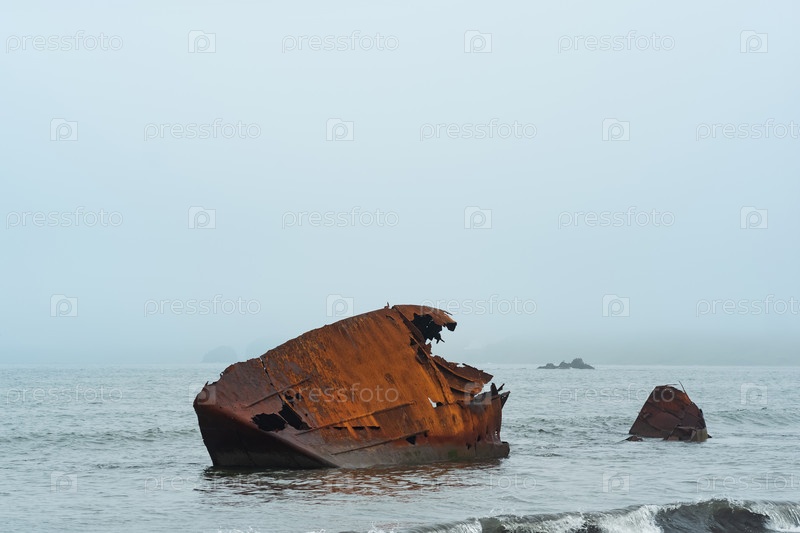 Ржавое кораблекрушение, остатки корабля, выброшенного на берег на фоне туманного морского пейзажа
