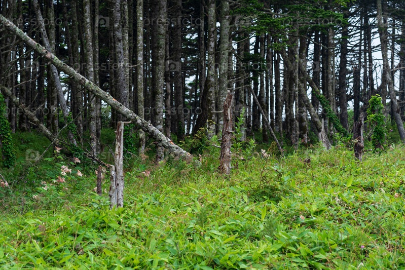 Прибрежный лес с буреломом и зарослями карликового бамбука на тихоокеанском побережье, Курильские острова