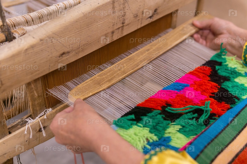 Процесс плетения гобелена на традиционном деревянном ткацком станке