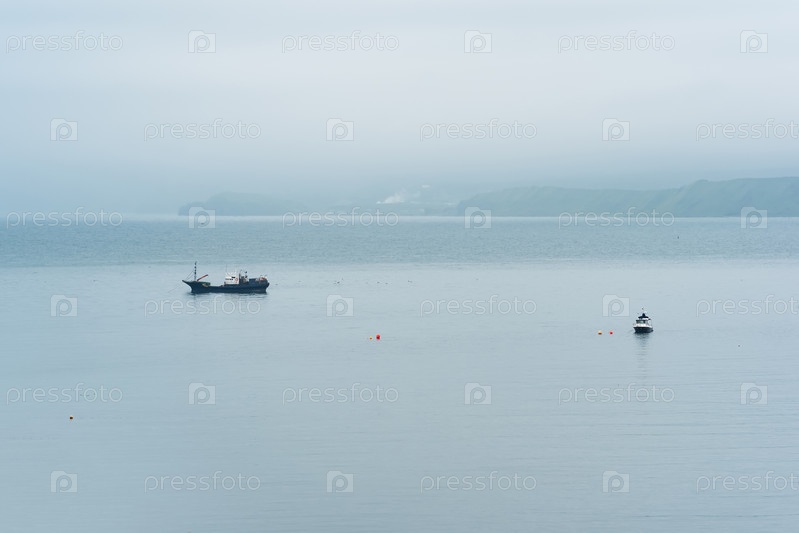 Рыбацкие лодки в море на фоне далекого туманного берега
