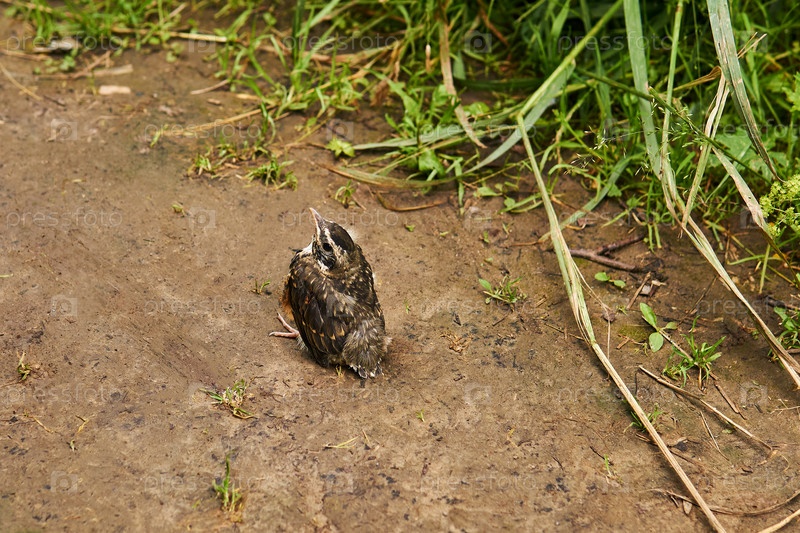 Неоперившийся малиновка сидит на тропинке