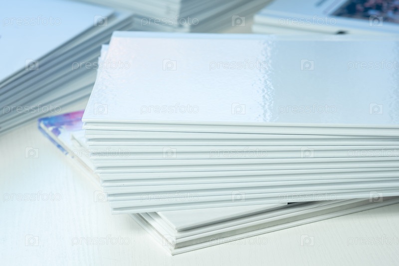 Стопки свежеотпечатанных фотокниг с чистыми пустыми белыми обложками на столе крупным планом