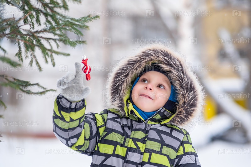 Ребенок осматривает дворовую елку на улице снежной зимой