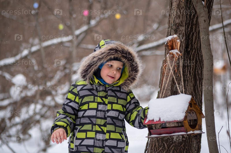 Ребенок в зимнем парке кормит птиц с помощью кормушки