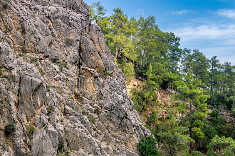Горный пейзаж - отвесная скала с двумя сернами и лесистым склоном