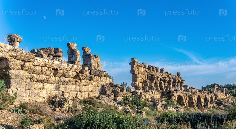 Руины древних городских стен на фоне неба с луной в Сиде, Турция