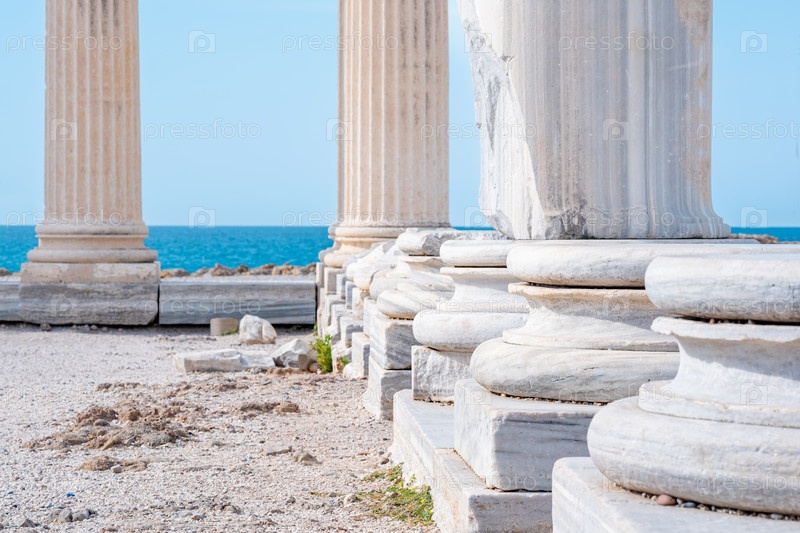 Фрагмент колоннады разрушенного храма Аполлона в Сиде на фоне моря