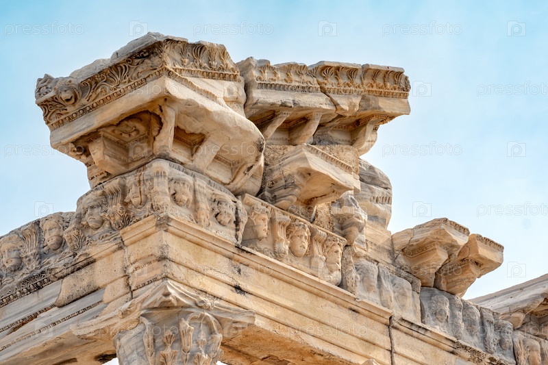 Фрагмент антаблемента разрушенного храма Аполлона в Сиде с каменным рельефом на фризе