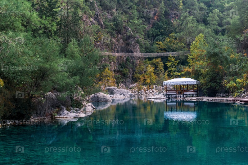Осенний горный пейзаж с тенистым озером, беседкой для пикника и подвесным мостом
