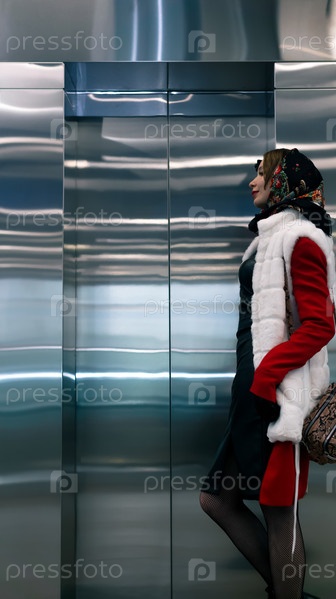 Молодая женщина стоит и ждет лифт