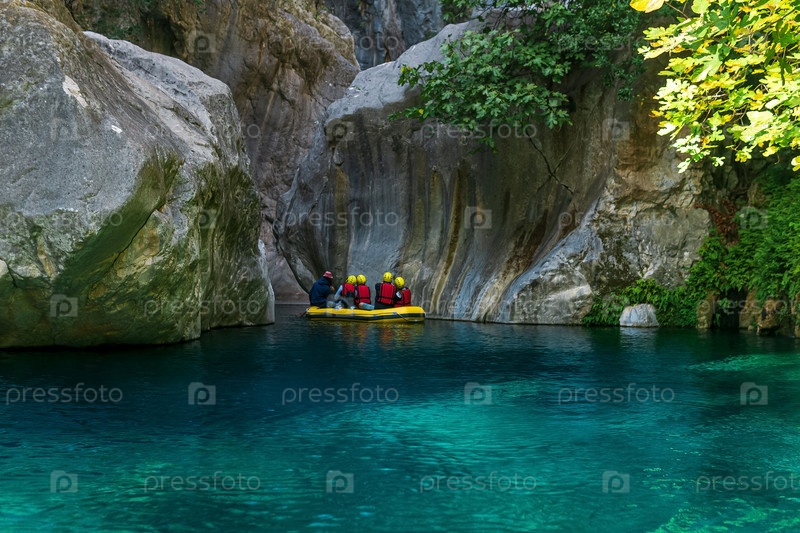 Туристы и гид на надувной лодке плывут по скалистому каньону с голубой водой в Гейнюке, Турция