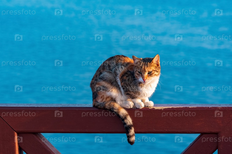 Кот сидит на заборе на фоне моря