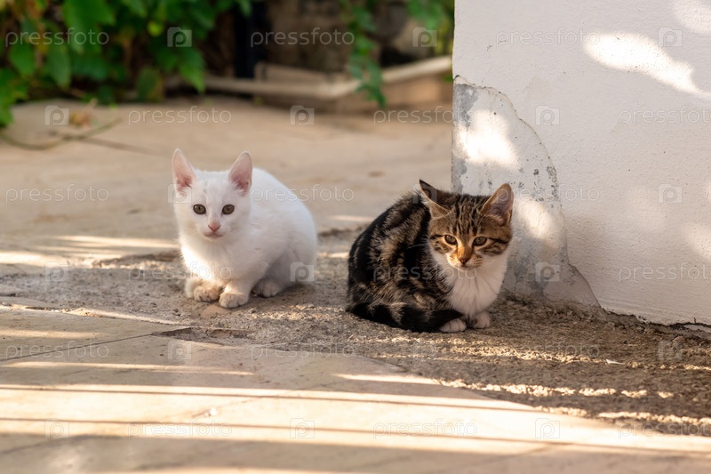 Два котенка сидят на дорожке в саду возле стены