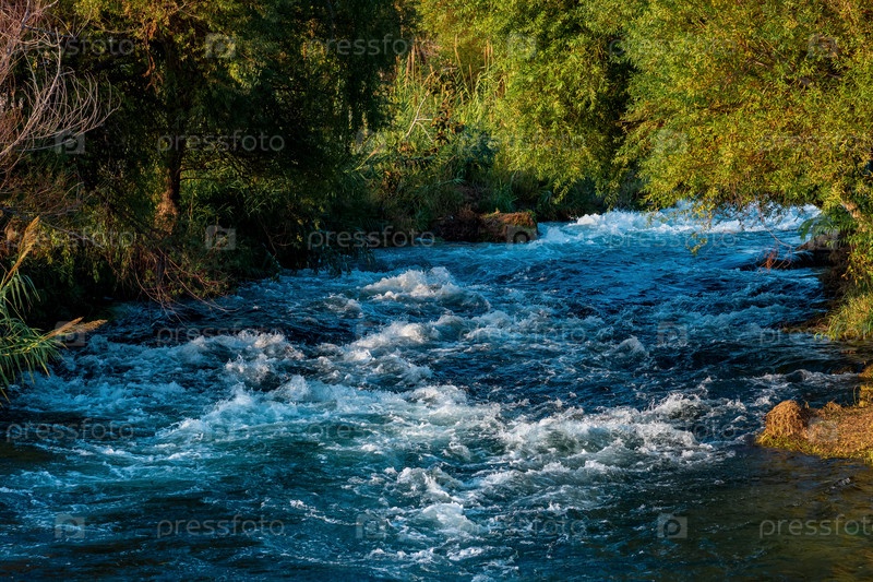Быстрая горная река течет среди лесистых берегов