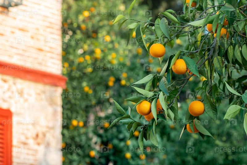 Спелые апельсины на ветке на фоне размытого сада и сельского дома