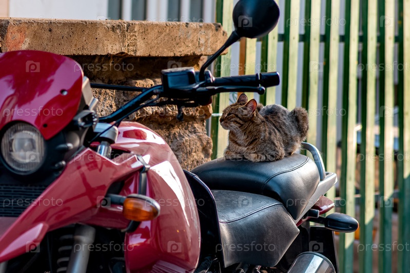 Бездомный кот дремлет на седле припаркованного мотоцикла