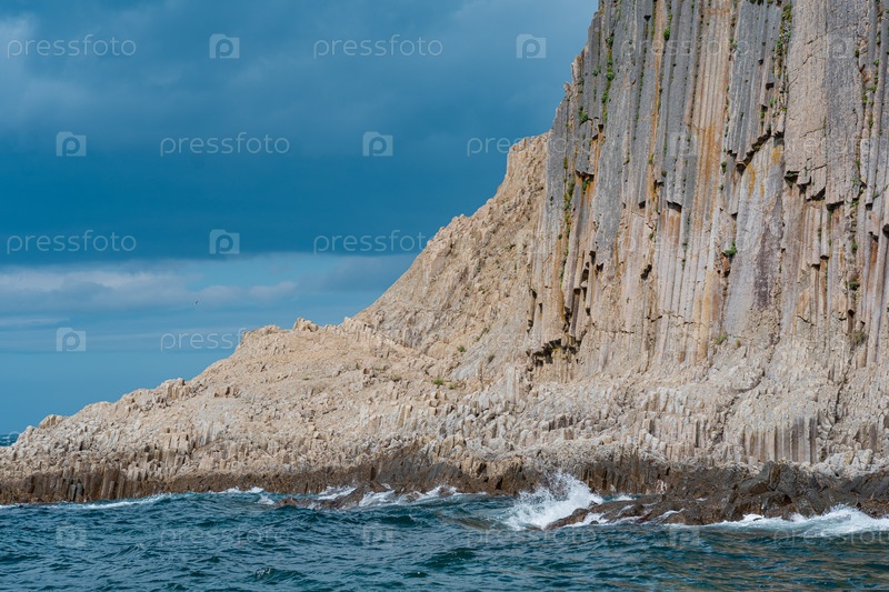 Побережье острова Кунашир на мысе Столбчатый с базальтовыми колоннами в пасмурную погоду