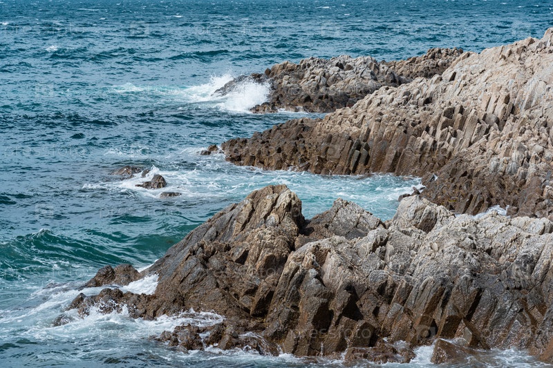 Скалистый берег моря, образованный столбчатым базальтом на фоне моря, прибрежный ландшафт Курильских островов