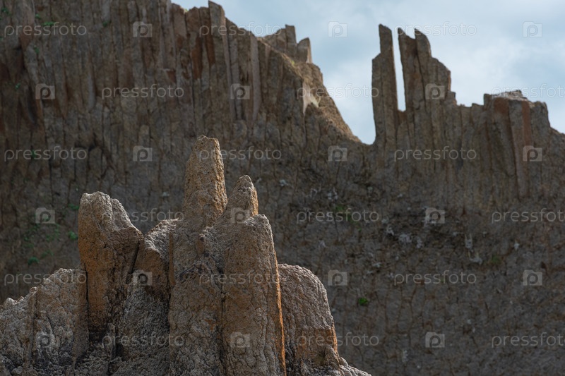 Природный вулканический ландшафт, вершины зазубренных скал, образованных столбчатым базальтом