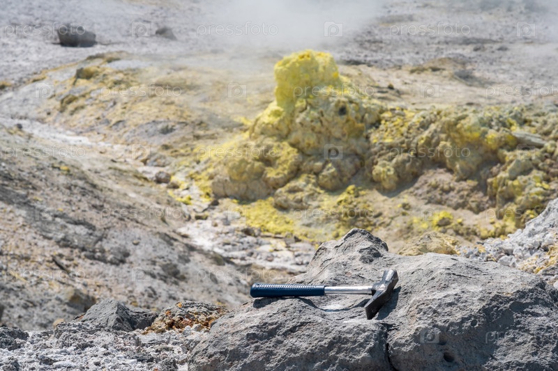 Геологический молоток на скале на фоне дымящейся фумаролы на склоне вулкана