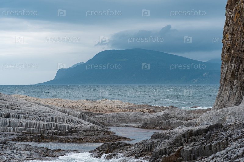 Облачный скалистый берег моря, образованный столбчатым базальтом на фоне бурного моря, прибрежный ландшафт Курильских островов