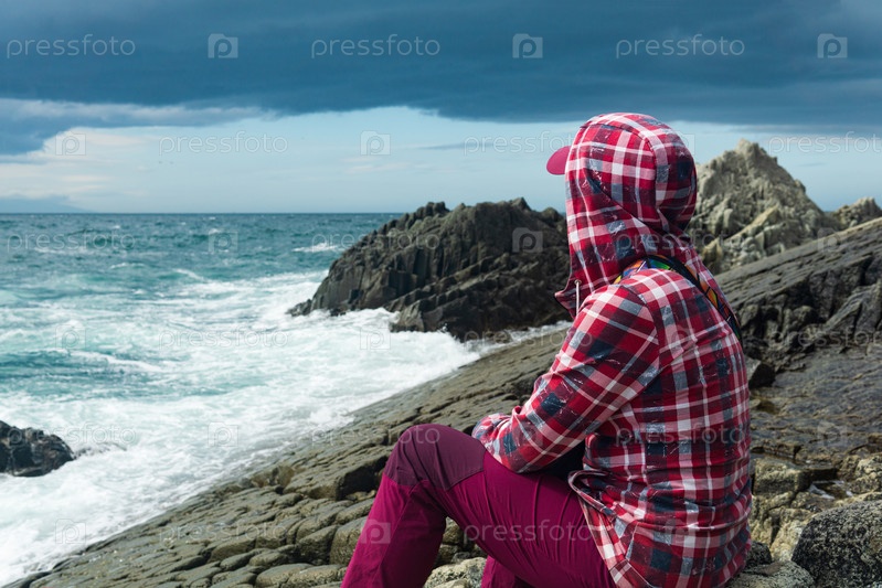 Путешественник сидит на берегу бурного моря, на естественном тротуаре из столбчатого гранита