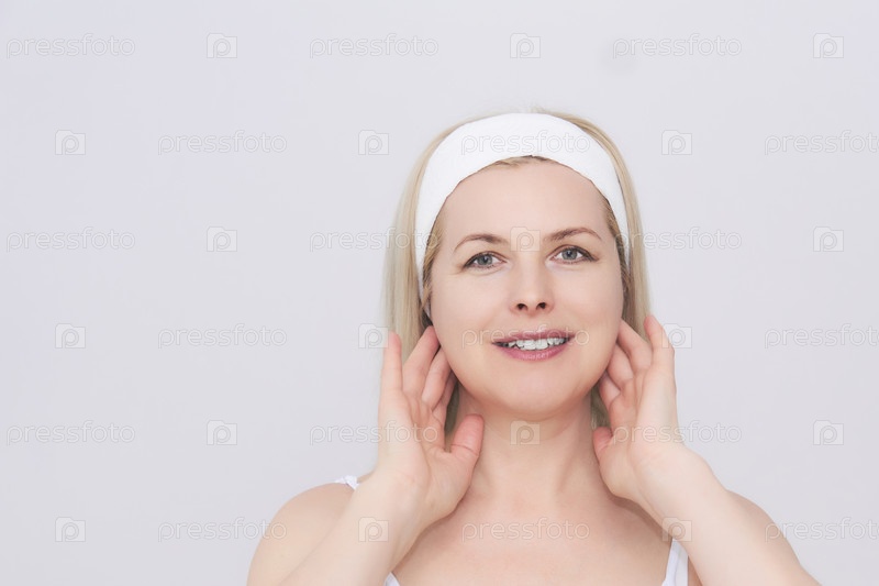 Женщина средних лет делает самомассаж лица и шеи в области лимфатических узлов