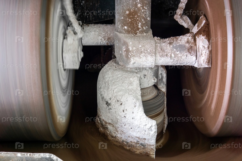 Жернова промышленного меланжера измельчают какао в процессе изготовления шоколада, размытые в движении