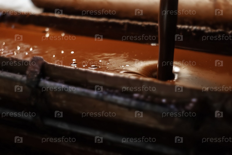 Расплавленный шоколад вылит в лоток на кондитерской фабрике, крупный план
