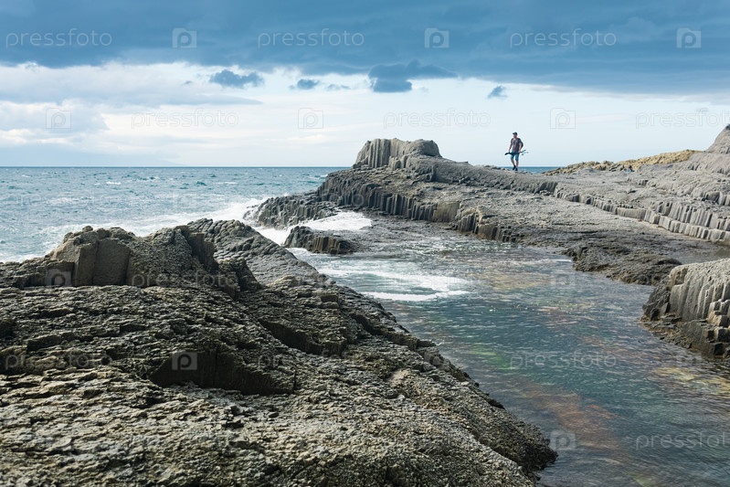 Прибрежный морской пейзаж с красивыми столбчатыми базальтовыми скалами во время отлива, рыбак виден вдалеке в размытии