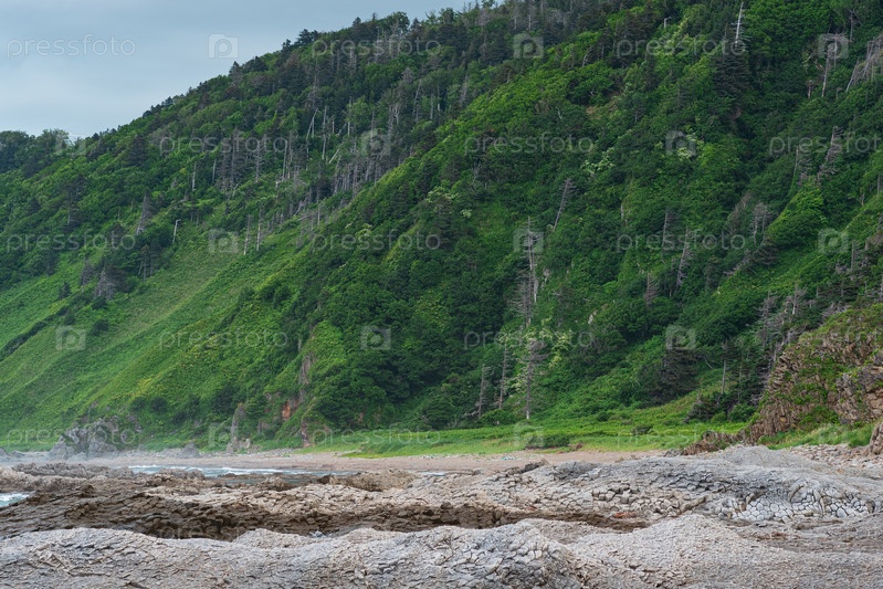 Прибрежный пейзаж, красивые лесистые скалы на зеленом побережье острова Кунашир