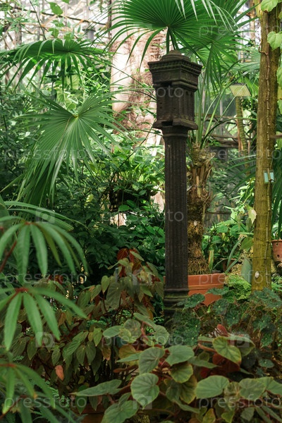 Интерьер старинной тропической оранжереи со старой чугунной колонной среди растений