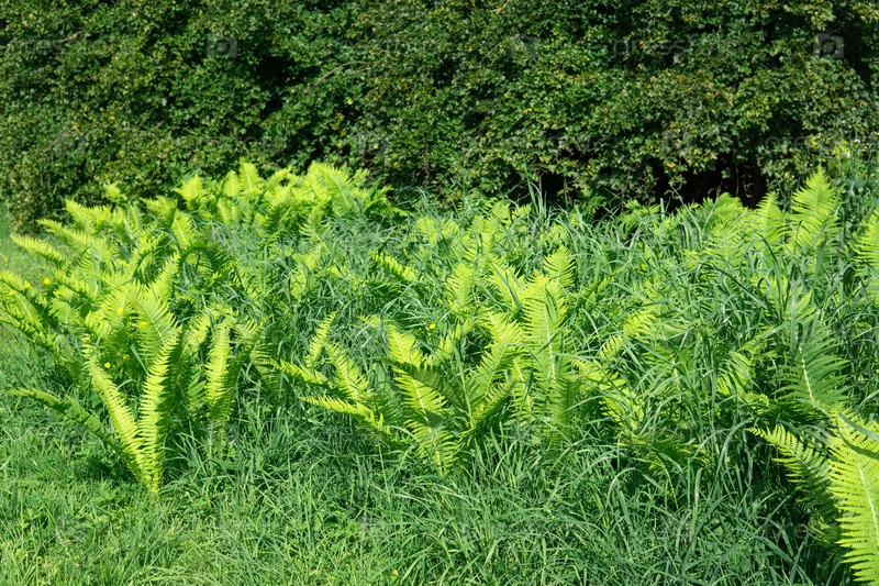 Природный ландшафт, сочная растительность с травой и папоротниками на опушке леса