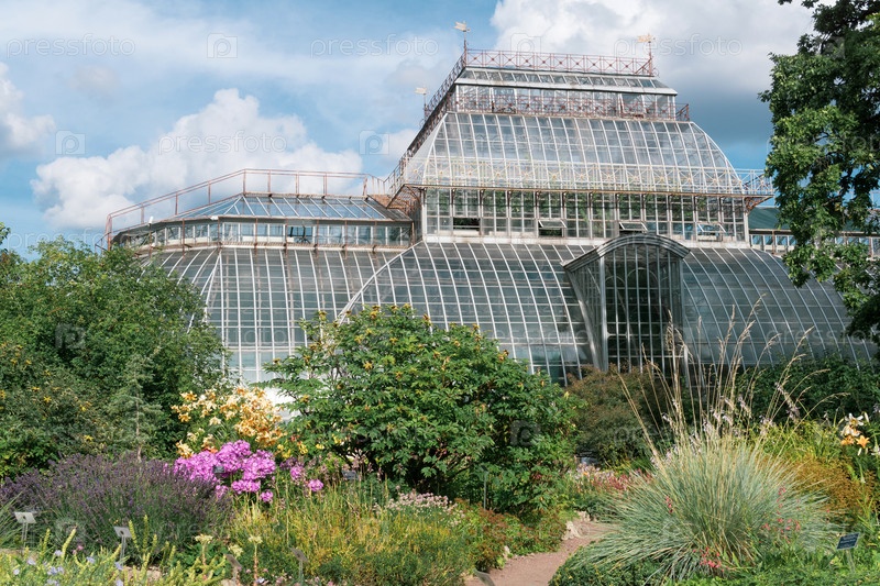Вид на Ботанический сад Санкт-Петербурга с клумбами и старинной пальмовой оранжереей на заднем плане
