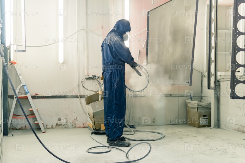 Рабочий покрывает стальные детали порошковой краской в покрасочной камере