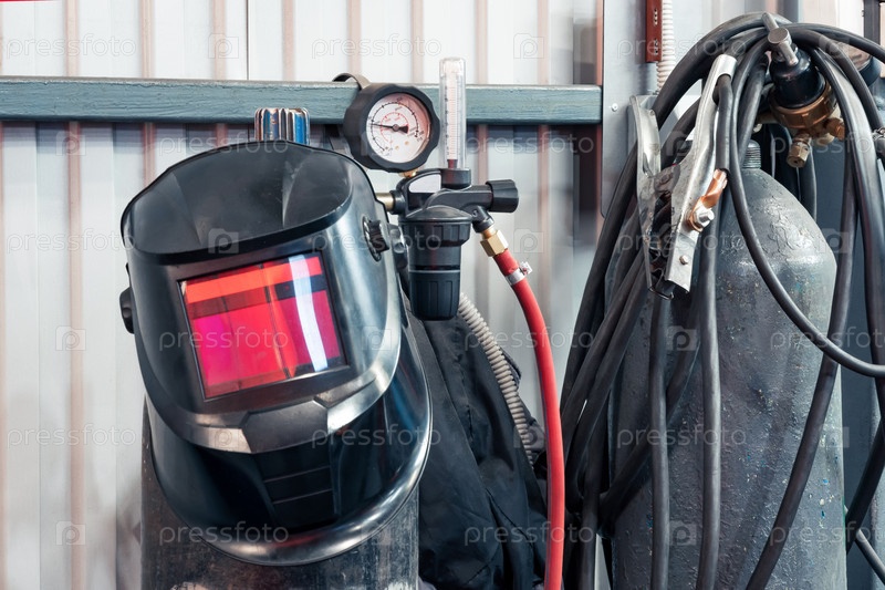 Оборудование для газовой сварки в цеху: маска, баллоны с манометром, шланги