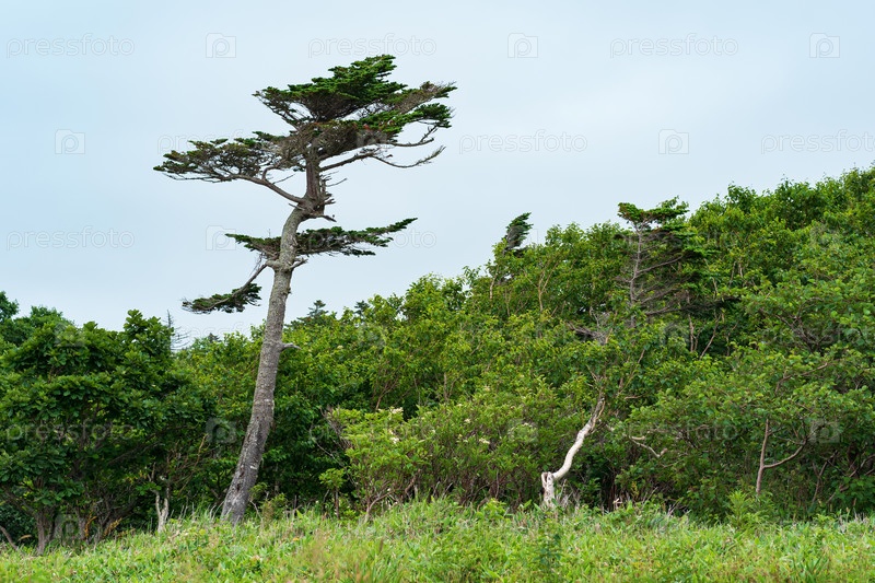 Пейзаж с кривой сосной над невысоким прибрежным лесом