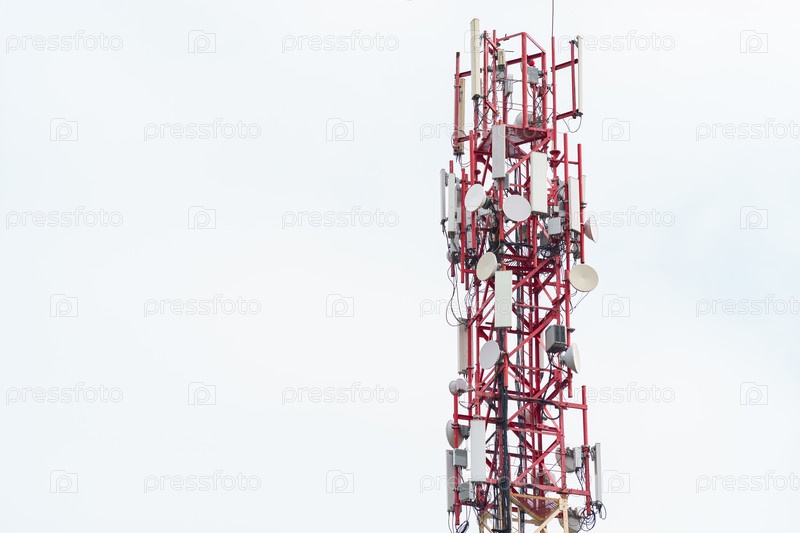 Верхняя часть радиовышки с установленными антеннами и другим оборудованием на фоне белого облачного неба