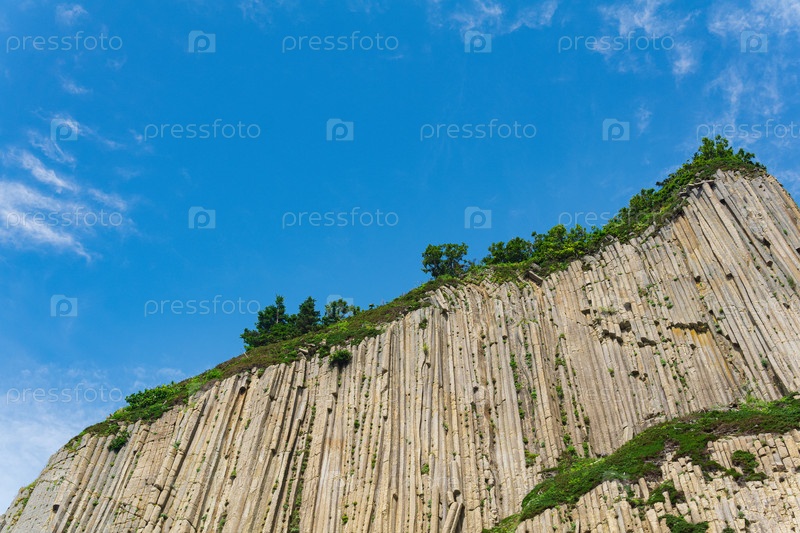 Вершина столбчатого вулканического базальтового утеса на фоне неба с облаками