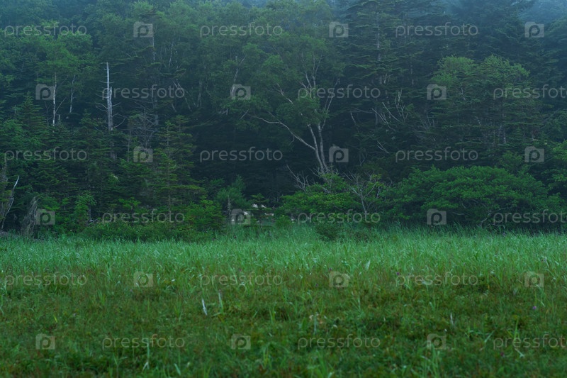 Сумеречная утренняя лесная опушка в тумане, природный ландшафт
