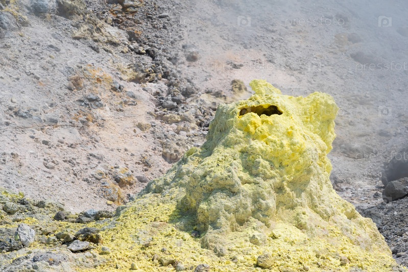 Отложения серы вокруг сольфатары в фумарольном поле вулкана