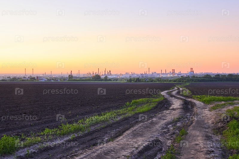 Вечерний сельский пейзаж с огромным нефтеперерабатывающим заводом на горизонте