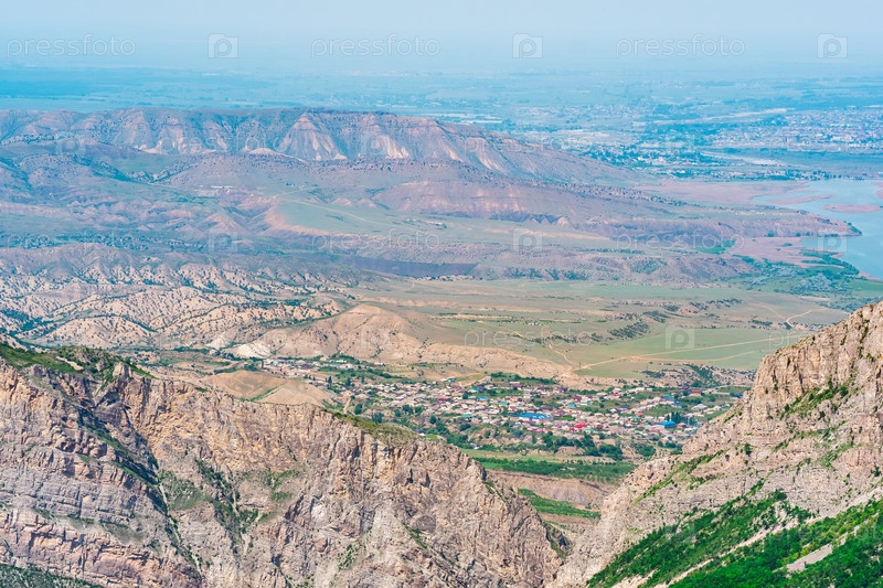 Горный пейзаж на Кавказе с видом на долину реки Сулак и города внизу на равнине