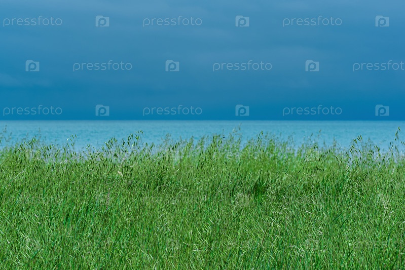 Луг с зеленой колючей травой на берегу моря